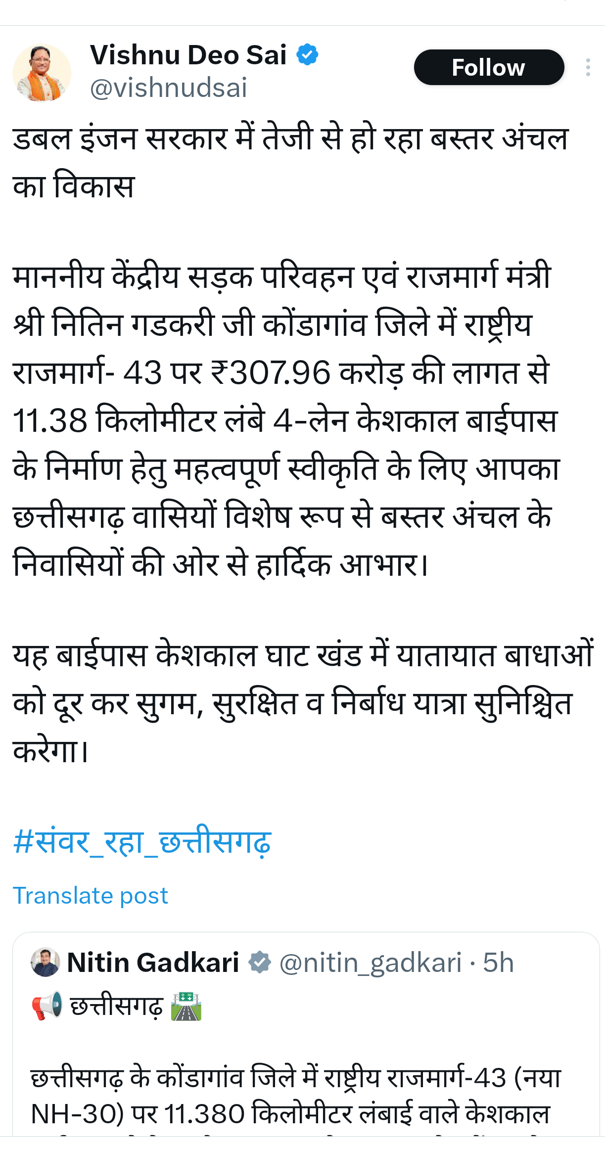 केंद्रीय सड़क परिवहन एवं राजमार्ग मंत्री श्री नितिन गडकरी ने ट्वीट कर दी जानकारी: मुख्यमंत्री श्री साय ने आभार प्रकट करते हुए बस्तर के विकास के लिए बताया निर्णायक कदम