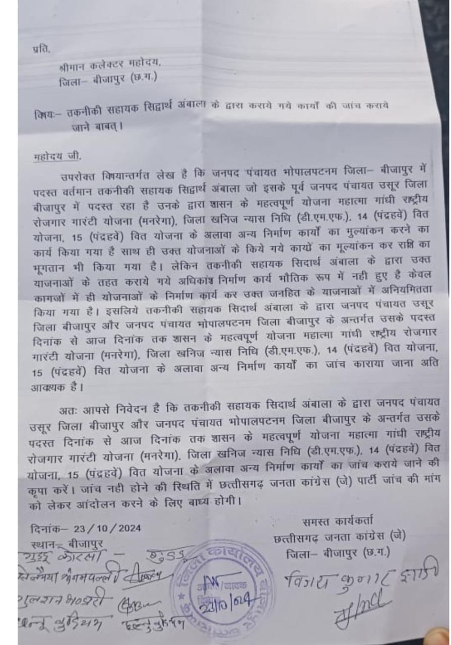 छत्तीसगढ़ जनता कांग्रेस (जोगी) के अध्यक्ष विजय झाड़ी ने बताया कि जनपद पंचायत भोपालपटनम में पदस्थ तकनीकी सहायक सिदार्थ अंबाला के द्वारा जनपद पंचायत उसूर जिला बीजापुर और जनपद पंचायत भोपालपटनम में उनके पदस्थापना से आज दिनांक तक शासन के महत्वपूर्ण योजनाओं और निर्माण कार्यों की जांच की मांग जिला कलेक्टर से की गई है।