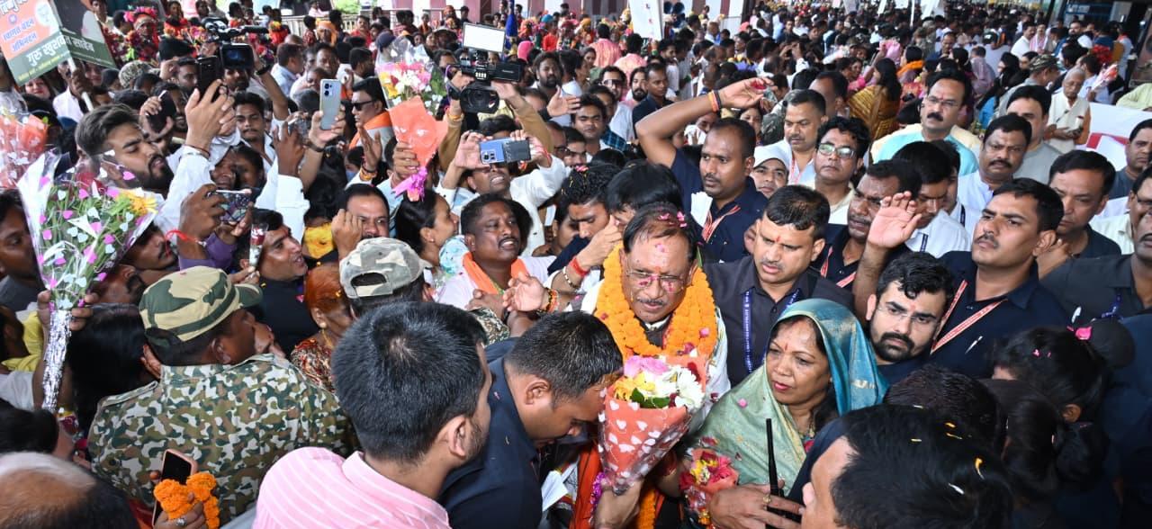 एयरपोर्ट पर हुआ भव्य स्वागत, कर्मा-पंथी नृत्यों से सराबोर रहा एयरपोर्ट परिसर