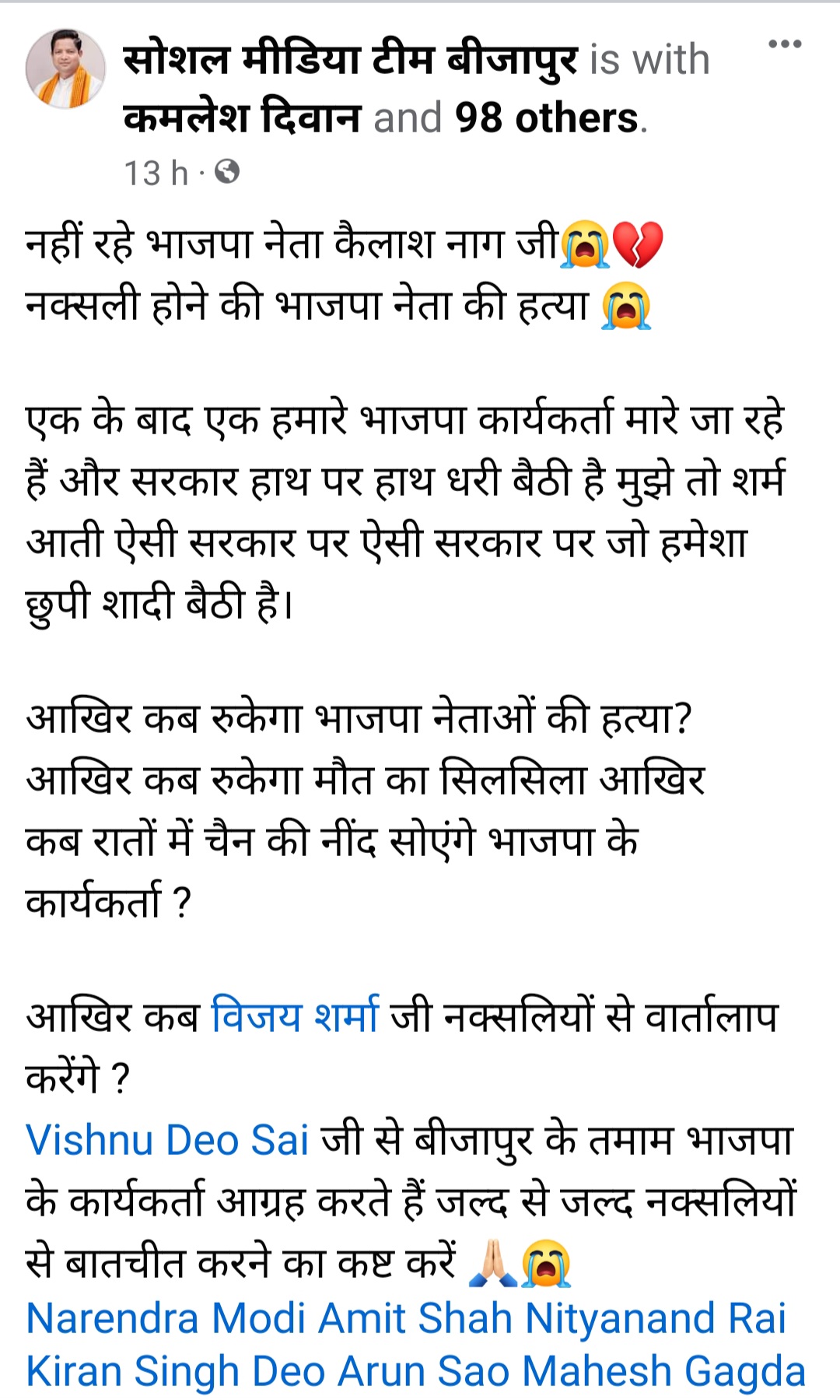 बीजेपी नेतृत्व जब पश्चिम बंगाल में बीजेपी का कार्यकर्ता की हत्या होती तो उसे राजनीतिक हत्या बताकर TMC पर आरोप लगाता है ,कर्नाटक में बीजेपी कार्यकर्ता की हत्या होती है तो कांग्रेस पर आरोप लगाती ,इसी तरह केरल में बीजेपी कार्यकर्ता मारा जाता है तो कम्युनिस्ट पार्टी और छत्तीसगढ़ में अक्टूबर 2023 तक हुई नक्सली हत्याओं का आरोप भी बीजेपी ने अप्रत्यक्ष रूप से तत्कालीन कांग्रेस सरकार पर लगाया था।