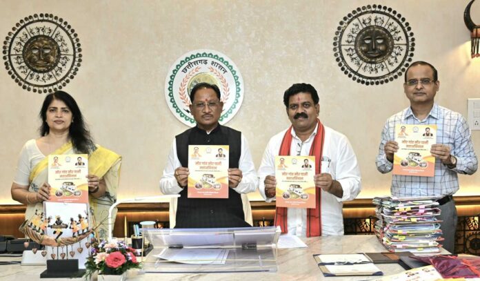 रायपुर, 16 जुलाई 2025// मुख्यमंत्री श्री विष्णु देव साय ने आज विधानसभा परिसर स्थित अपने कक्ष में ‘मोर गांव मोर पानी’ महाअभियान पर आधारित पुस्तिका का विमोचन किया। इस अवसर पर उन्होंने कहा कि पंचायती राज दिवस के अवसर पर प्रारंभ किए गए इस विशेष अभियान ने जल संरक्षण और संवर्धन के क्षेत्र में अभूतपूर्व चेतना उत्पन्न की है। विमोचन कार्यक्रम में उप मुख्यमंत्री श्री विजय शर्मा, प्रमुख सचिव पंचायत श्रीमती निहारिका बारीक, आयुक्त मनरेगा और संचालक प्रधानमंत्री आवास योजना श्री तारण प्रकाश सिन्हा सहित अनेक अधिकारी उपस्थित थे।