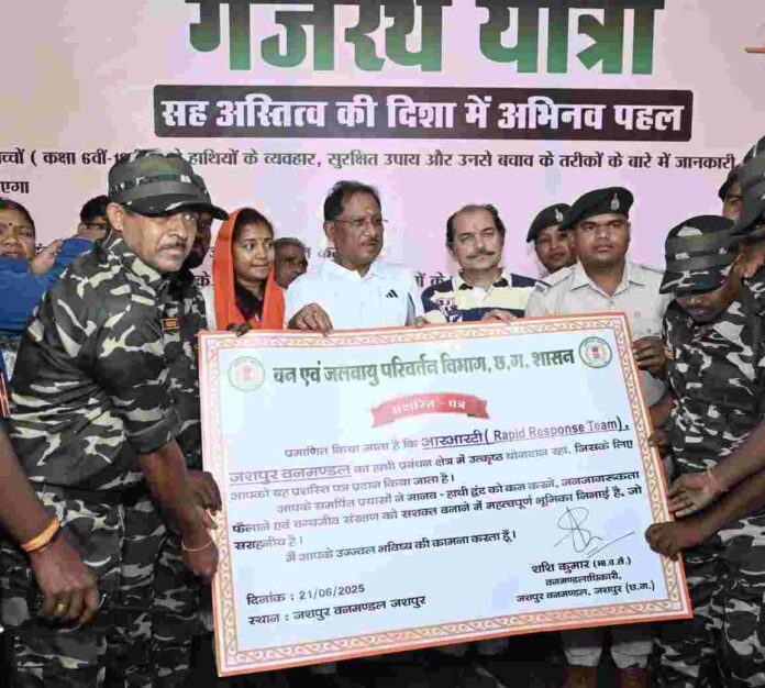 रायपुर 21 जून 2025/अंतरराष्ट्रीय योग दिवस के अवसर पर मुख्यमंत्री श्री विष्णु देव साय ने आज जशपुर के रणजीता स्टेडियम परिसर में आयोजित कार्यक्रम में ‘गजरथ यात्रा’ को हरी झंडी दिखाकर शुभारंभ किया। यह अभिनव पहल छत्तीसगढ़ में मानव-हाथी द्वंद को कम करने और वन्यजीव संरक्षण के लिए जनजागरूकता फैलाने के उद्देश्य से शुरू की गई है। इस यात्रा के माध्यम से स्कूलों, ग्राम पंचायतों और हाट-बाजारों में पहुंचकर हाथियों के व्यवहार, सुरक्षा उपायों और सह-अस्तित्व के संदेश को जन-जन तक पहुंचाया जाएगा।