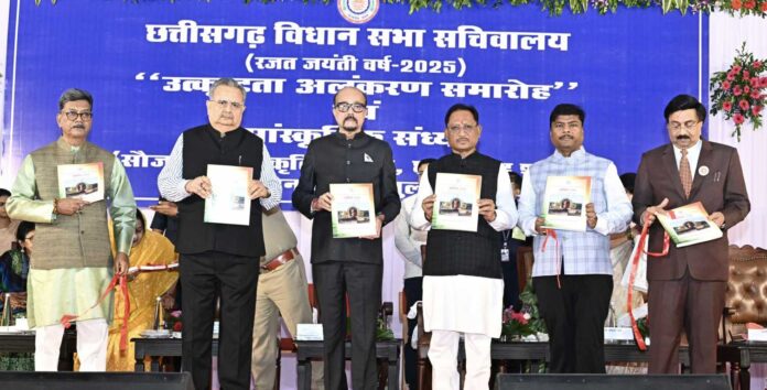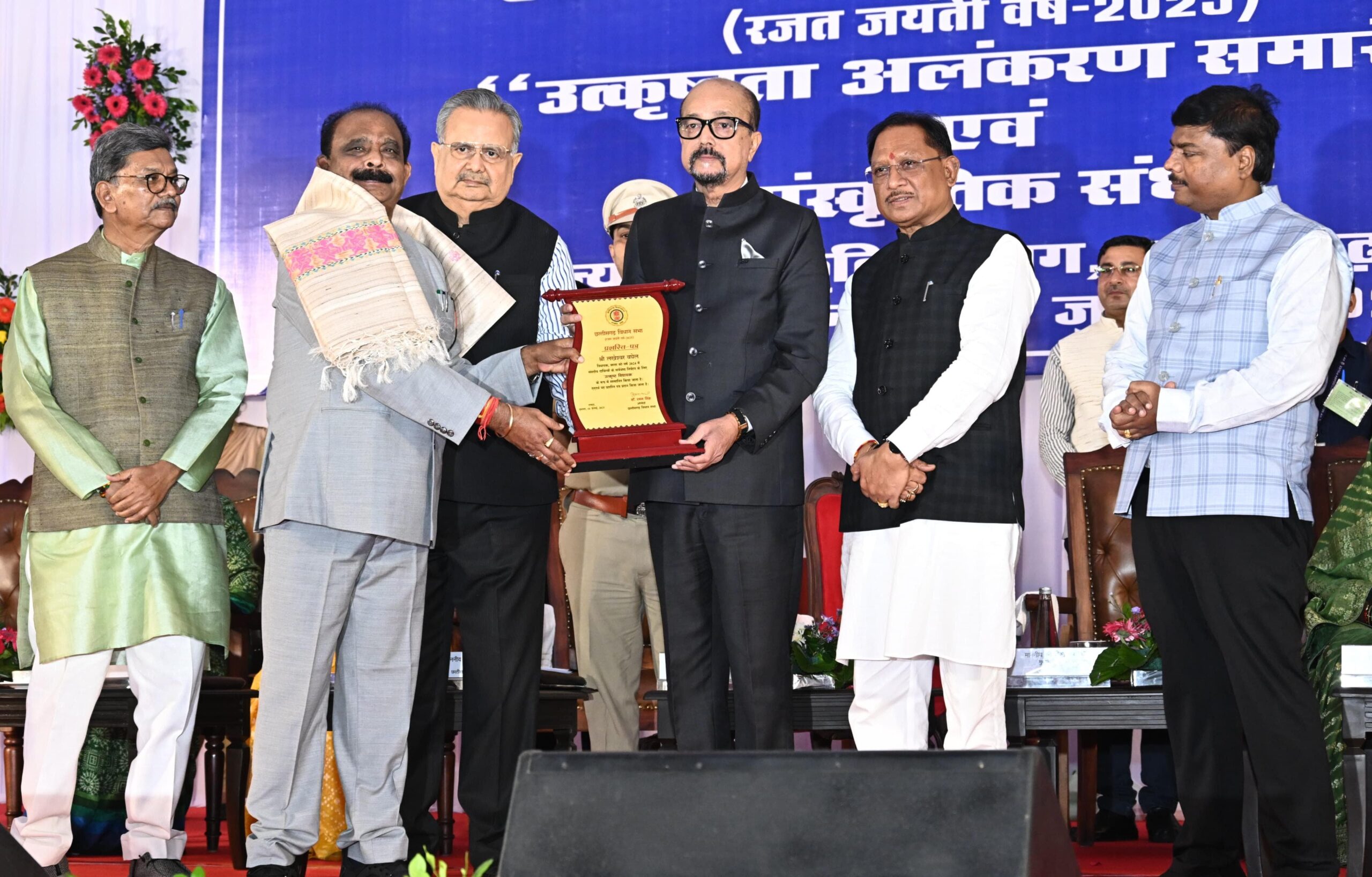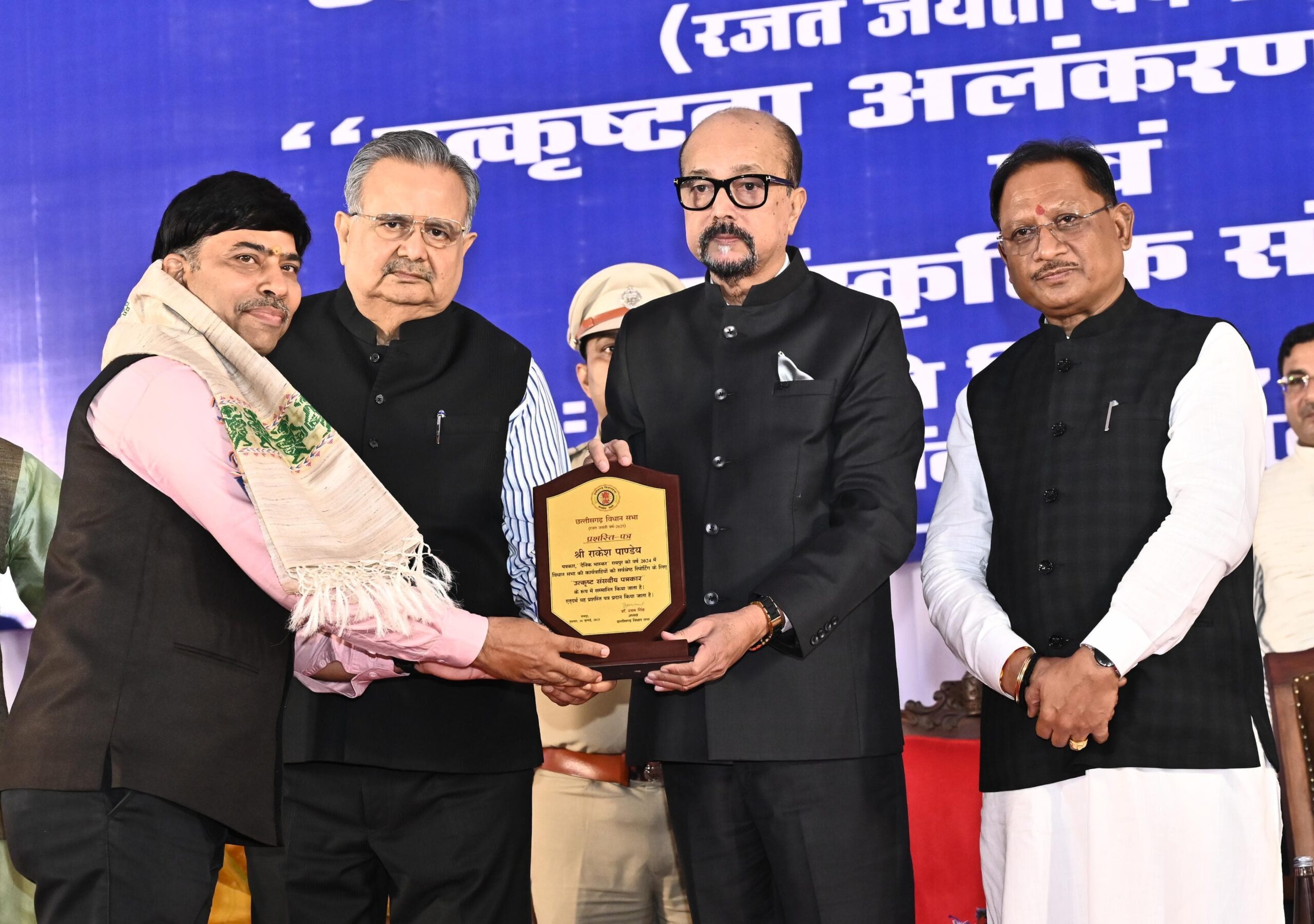 रायपुर. 16 जुलाई 2025. राज्यपाल श्री रमेन डेका के मुख्य आतिथ्य में आज छत्तीसगढ़ विधानसभा परिसर में आयोजित “उत्कृष्टता अलंकरण समारोह” गरिमामय वातावरण में संपन्न हुआ। विधानसभा अध्यक्ष डॉ. रमन सिंह ने समारोह की अध्यक्षता की। मुख्यमंत्री श्री विष्णु देव साय और नेता प्रतिपक्ष डॉ. चरणदास महंत विशिष्ट अतिथि के रूप में समारोह में शामिल हुए। “उत्कृष्टता अलंकरण समारोह” में वर्ष-2024 के लिए श्रीमती भावना वोहरा और श्री लखेश्वर बघेल को उत्कृष्ट विधायक के रूप में सम्मानित किया गया। उत्कृष्ट संसदीय रिपोर्टिंग के लिए दैनिक भास्कर के विशेष संवाददाता डॉ. राकेश कुमार पाण्डेय, सुदर्शन न्यूज़ चैनल के राज्य ब्यूरो प्रमुख श्री योगेश मिश्रा और सुदर्शन न्यूज़ के कैमरामेन श्री विश्वप्रकाश पुरेना को समारोह में सम्मानित किया गया।